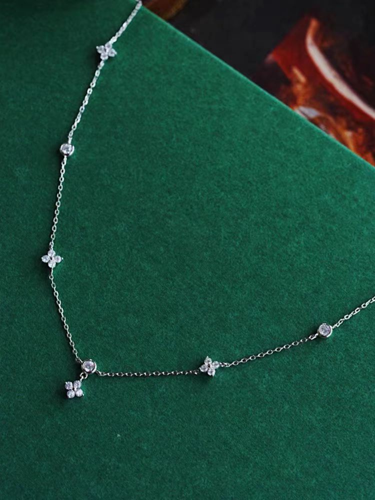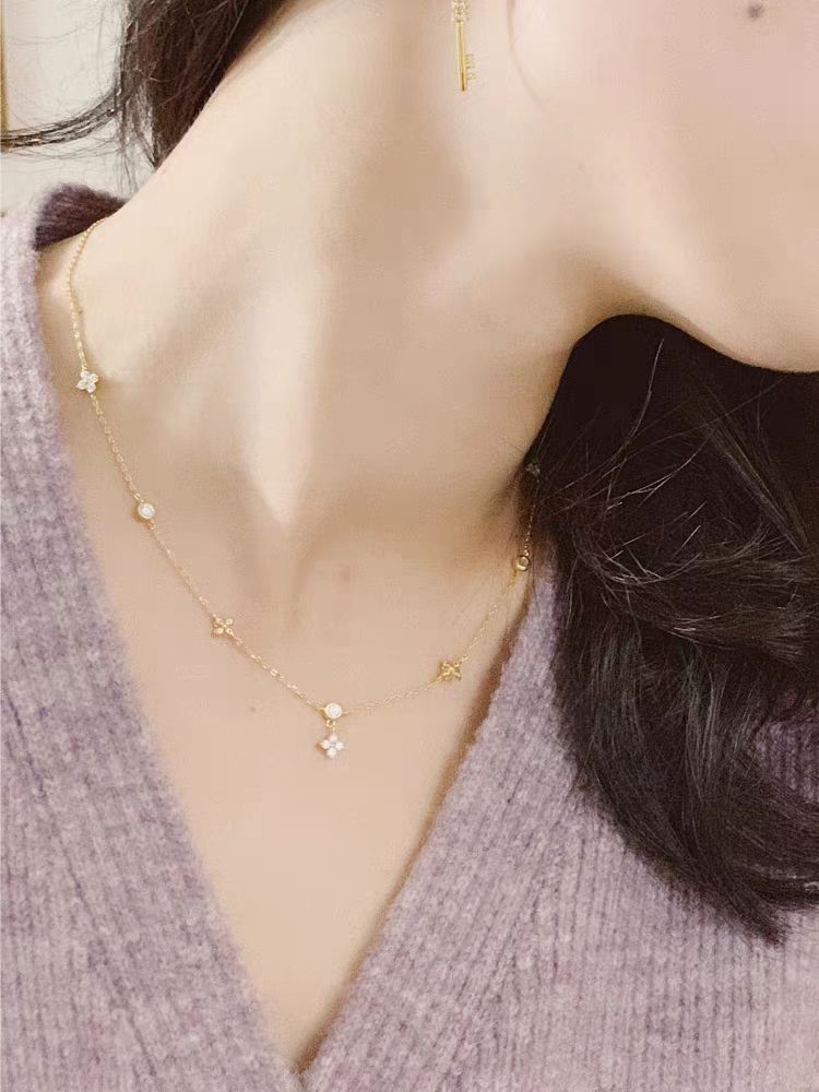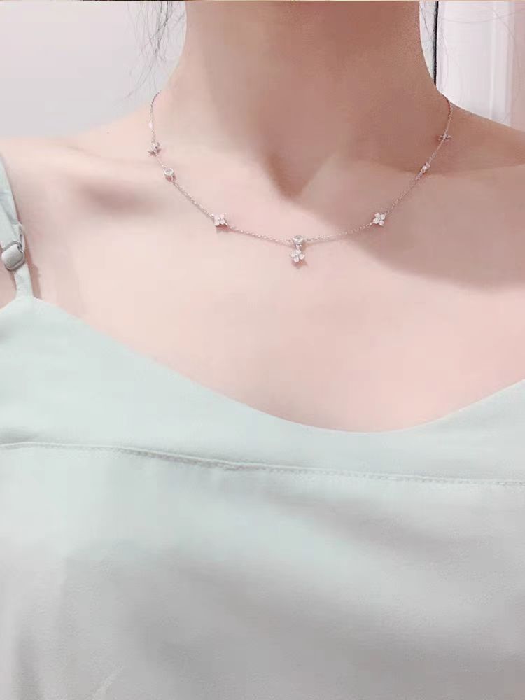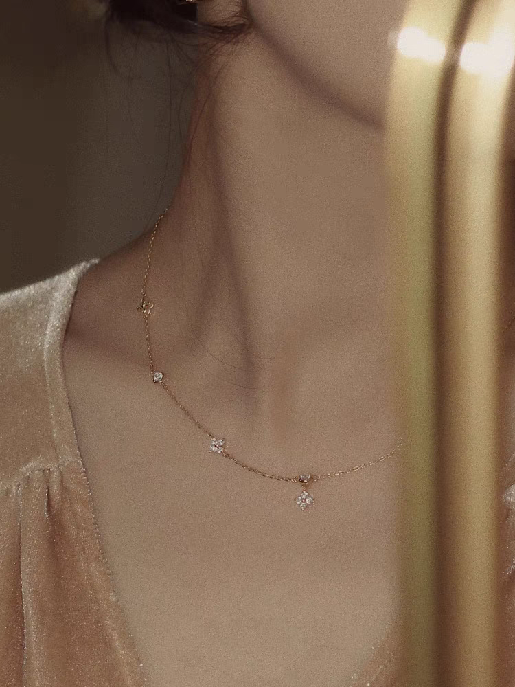The small diamond doesn't have much presence and is scattered around the neck casually, making it delicate and charming
